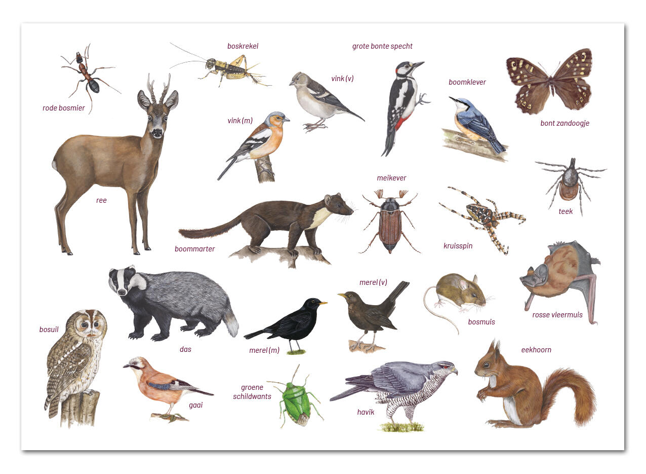 In de bossen van het Goois Natuurreservaat leven veel soorten planten en dieren: amfibieën, zoogdieren, vogels, insecten, schimmels, bomen en struiken. Op deze herkenningskaart zie je een aantal voorbeelden. Ga op zoek en kijk welke je kunt vinden!
